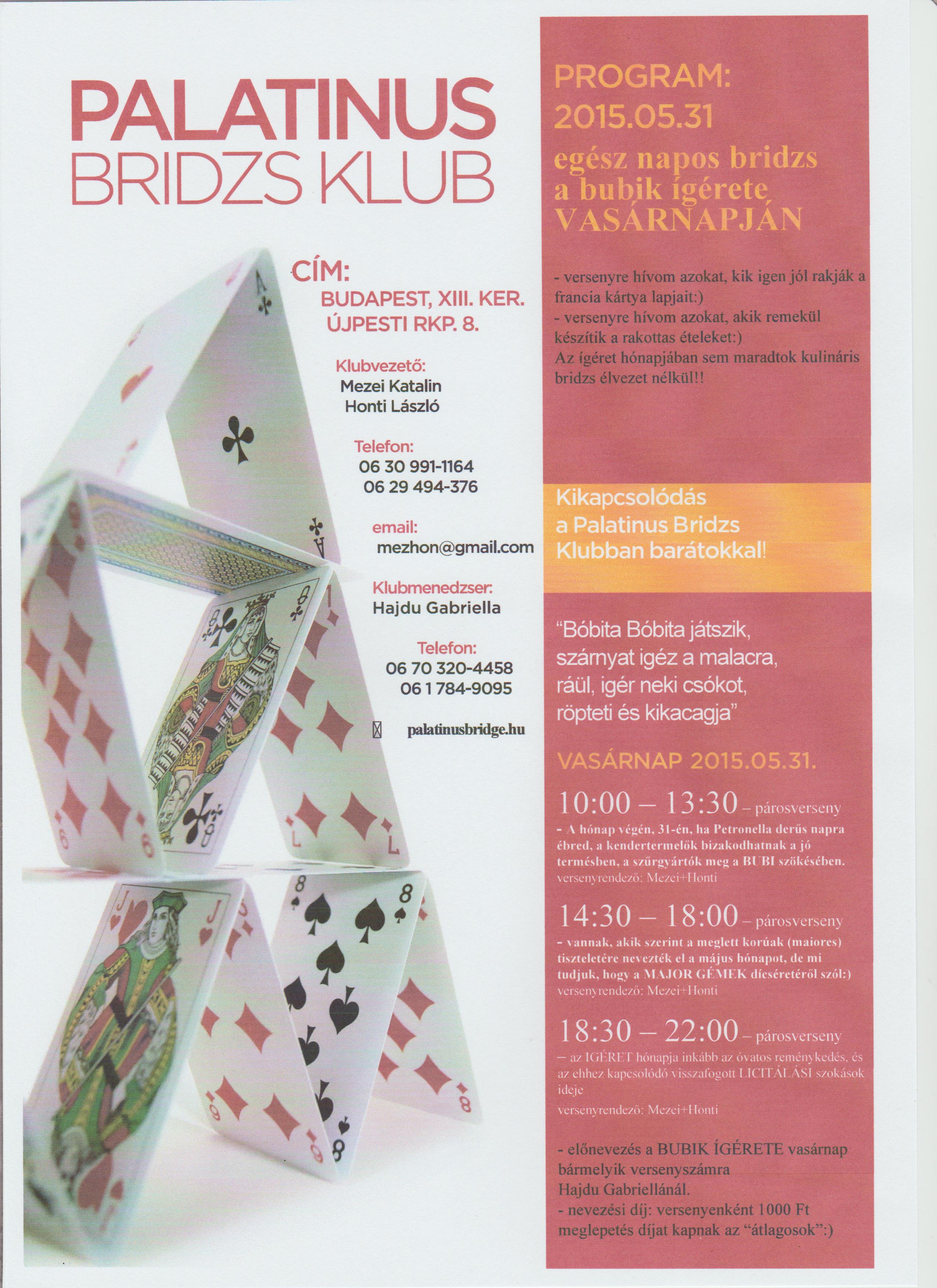 – A Palatinus Bridzs Klubban már szokásunkká vált, hogy minden hónap utolsó vasárnapján egész napos bridzs és kulináris program keretében tárgyaljuk át a hónap eseményeit. 2015.05.31.-én vasárnap sem lesz ez másként. A május utolsó vasárnapja bővelkedik mindenféle ünnepelendő eseményben: ez a Gyermeknapunk és ilyenkor ünnepeljük a hősöket is.
